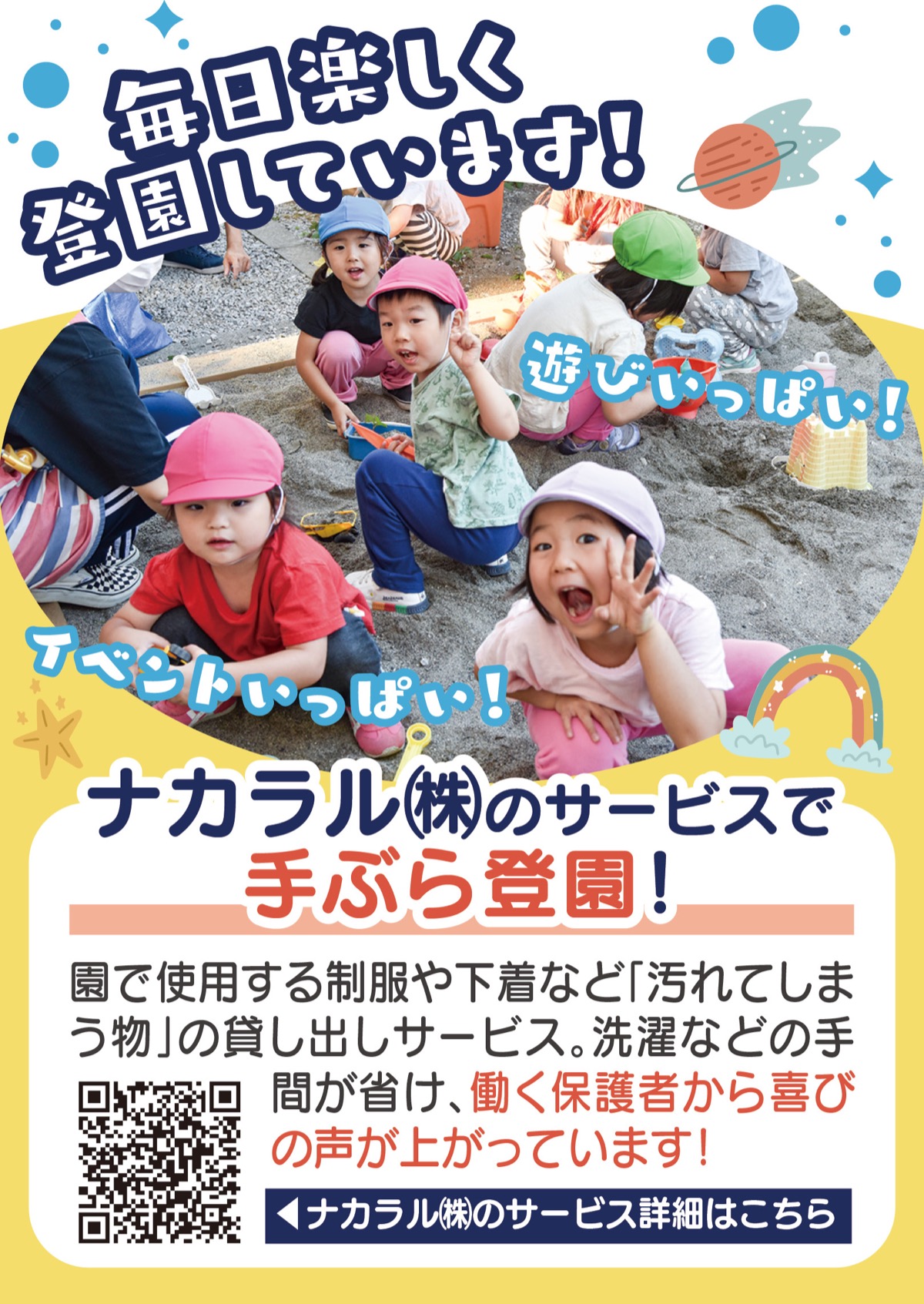 また、同園は保育事業を支援するナカラル(株)と提携。制服や下着など「汚れてしまう物」の貸し出しサービスを実施。登園準備や洗濯などの手間が省ける「手ぶら登園」が可能になり、働く保護者をサポートする。