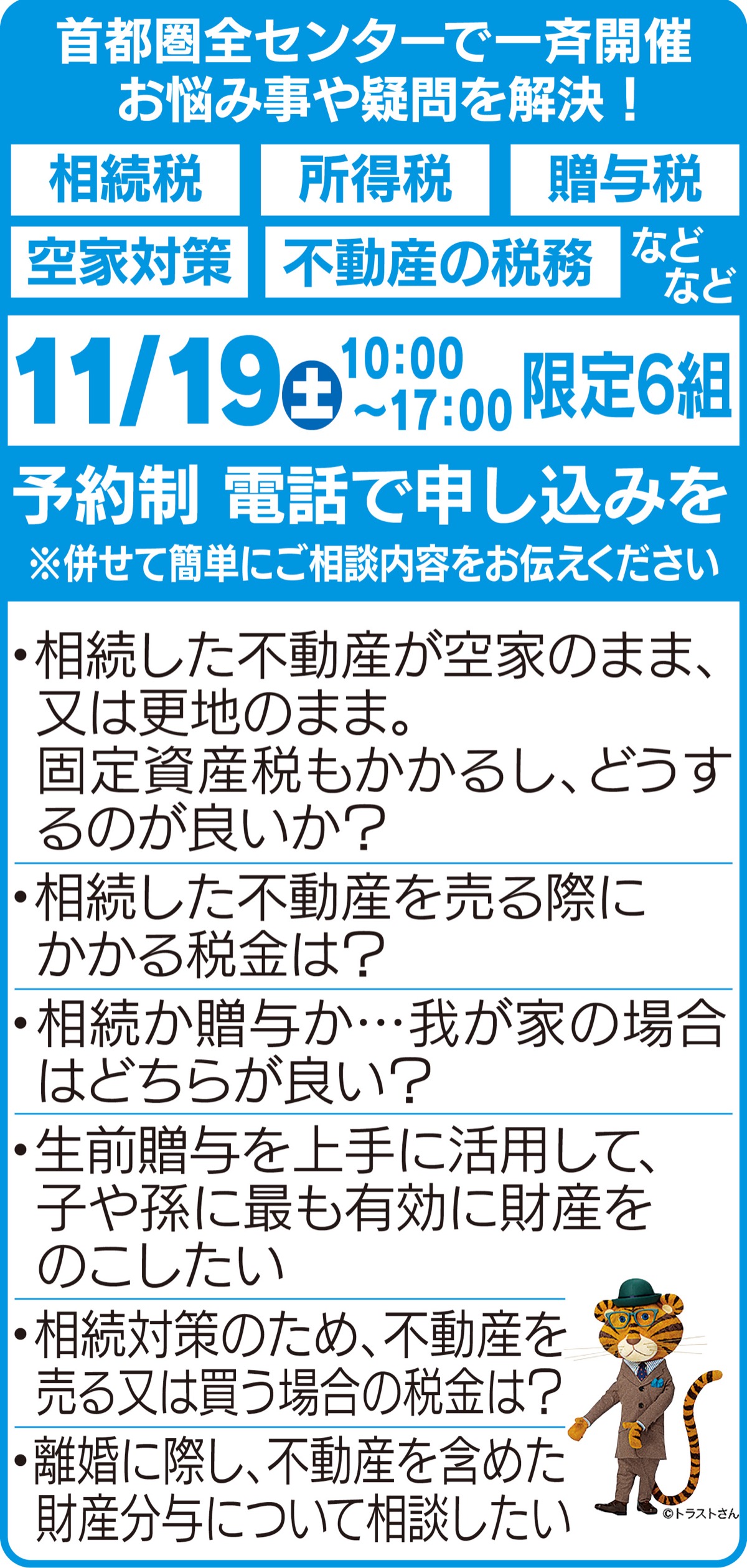 三井住友信託銀行グループ「三井住友トラスト不動産・武蔵小杉センター」は11月19日(土)、税理士による無料の個別相談会を開催する。