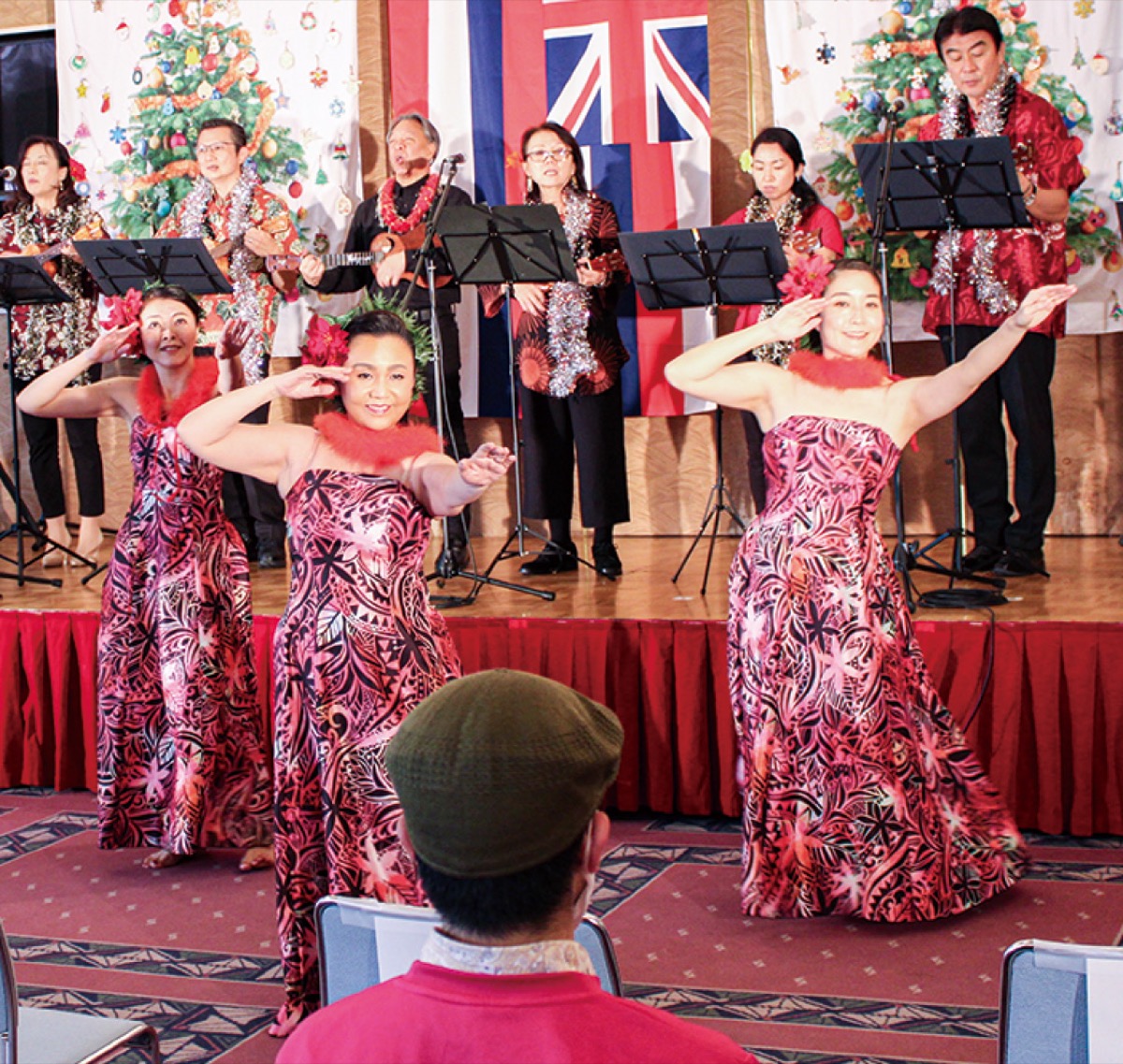 フラダンス=写真=や、音楽ステージのほか、ワークショップなどを開き、同実行委員会が続ける千羽鶴とハワイのレイを融合させた折り紙レイの寄贈活動にも多くの来場者が協力。招待した児童養護施設「新日本学園」の子どもら10人は、クリスマスツリーにオーナメントの飾りつけなどをして楽しんだ。