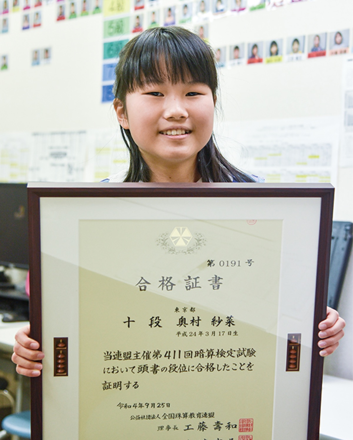 中原小学校5年生の奥村紗菜さん(10)が、全国珠算教育連盟主催の段位合格検定で最高位の10段に合格した。