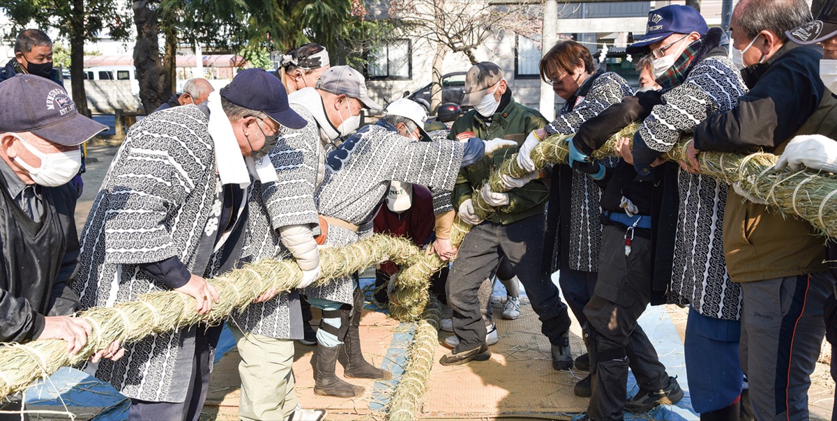 この日は、氏子らで構成されるおびしゃ保存会(野口新二会長)を中心に地域住民が参加した。しめ縄は、社殿に飾る直径約20センチ、長さ約6メートルの「男縄」と、ご神木に巻き付ける直径約16センチ、長さ約5メートルと若干小さい「女縄」の2本。参加者が分担して作業し、大量のわらで作った3本の縄で1本のしめ縄を作る作業では、会員らが力を合わせてより上げた。約3時間かけて2本の大きなしめ縄を完成させた。