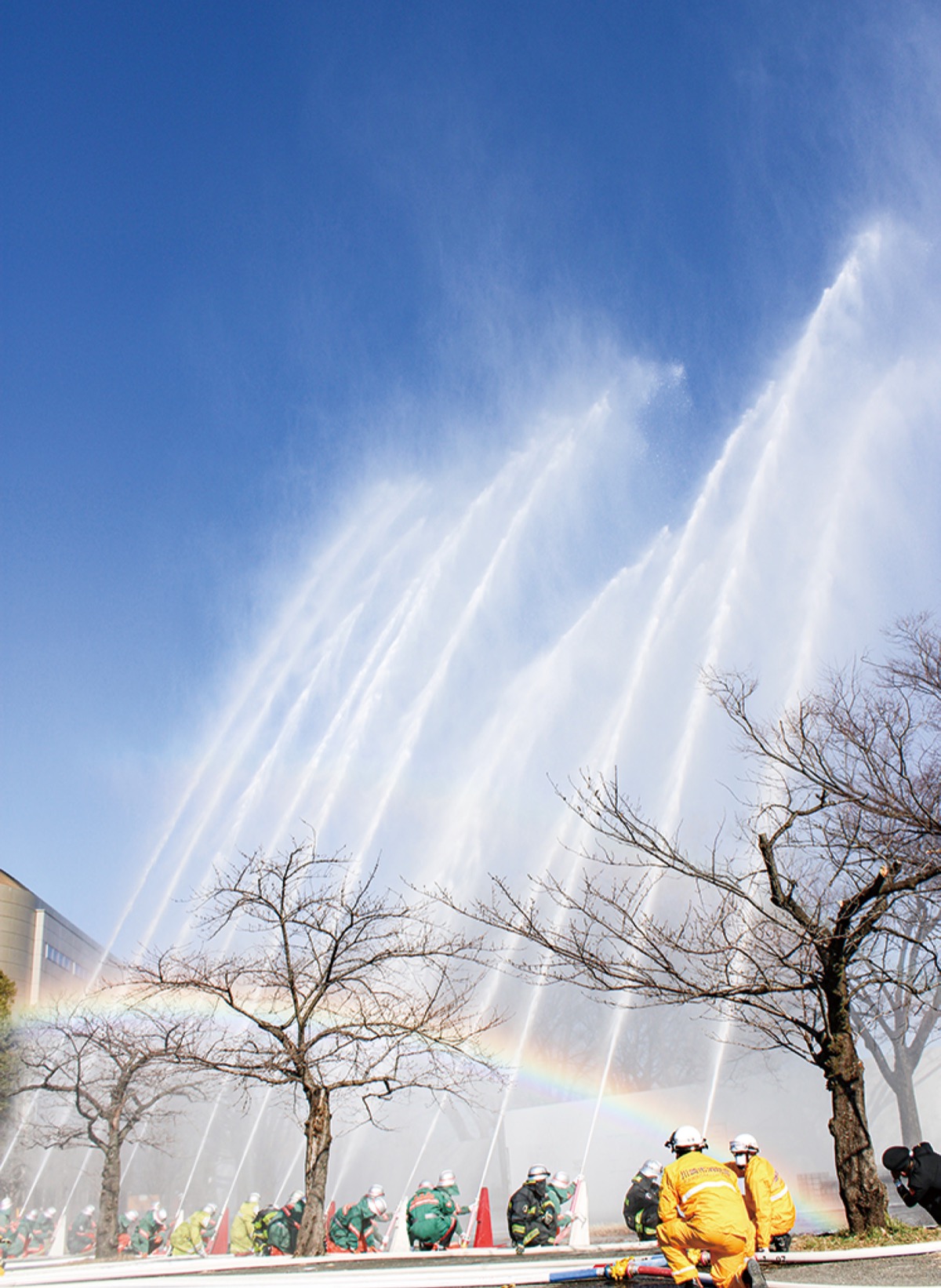 二部は会場を催し物広場に移し、観客が見守る中で分列行進やトラとウサギの面をかぶった団員が恒例の干支の引き継ぎを実施。最後に一斉放水を行うと、青空に大きな虹が浮かんだ。宮内から家族4人で来た40代の男性は「久しぶりに迫力ある一斉放水が見られてうれしかった。地域の消防団の頼もしさも感じられた」と話した。