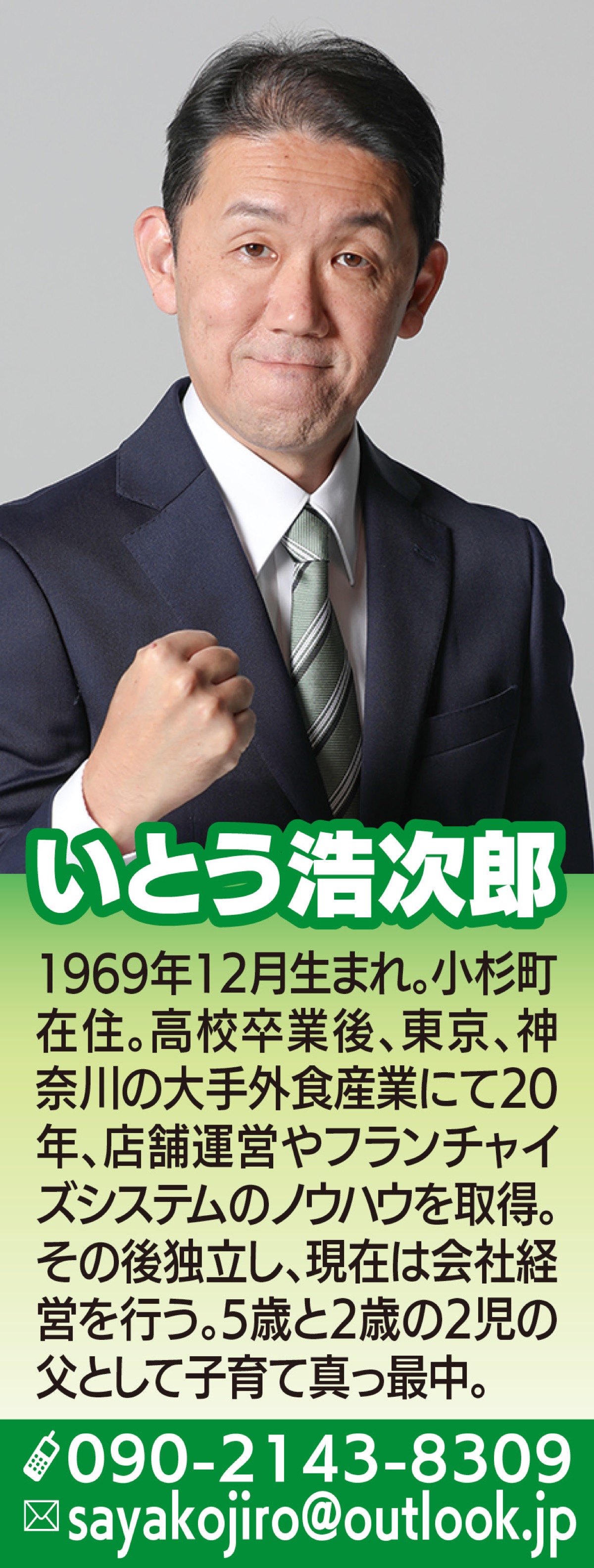 皆様初めまして、いとう浩次郎と申します。私は東京、神奈川の大手外食産業に20年勤め、店舗運営やフランチャイズシステムのノウハウを取得し、現在は地元・小杉町に暮らし会社経営を行っています。民間企業の中で取り組んできた組織づくりや会社経営で培った数字を見る目を活かし、日本維新の会中原区市政を担当しています。