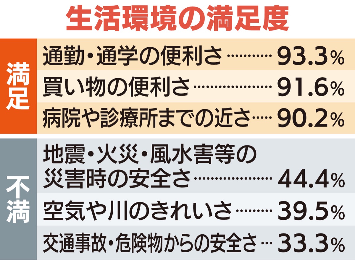 区民の定住性については74・5%が中原区に「これからも住んでいたい」と回答。「できれば市外へ移りたい」と答えたのは5・0%で全体の1割未満に留まった。理由の内訳は「住宅を購入した」が28・1%、「通勤・通学の便が良い」が27・2%、「以前から住んでいる」が13・3%、「まわりの環境が良い」が13・0%だった。区内の生活環境全体に関する満足度は「満足している」(18・9%)と「まあ満足している」(17・5%)が合わせて90・4%と初めて9割を超えた。中でも「通勤・通学の便利さ」「買い物の便利さ」「病院や診療所までの近さ」がいずれも90%以上と交通等の利便性の満足度が高く、「風紀上・防犯上の安全さ」も68・4%にのぼった。