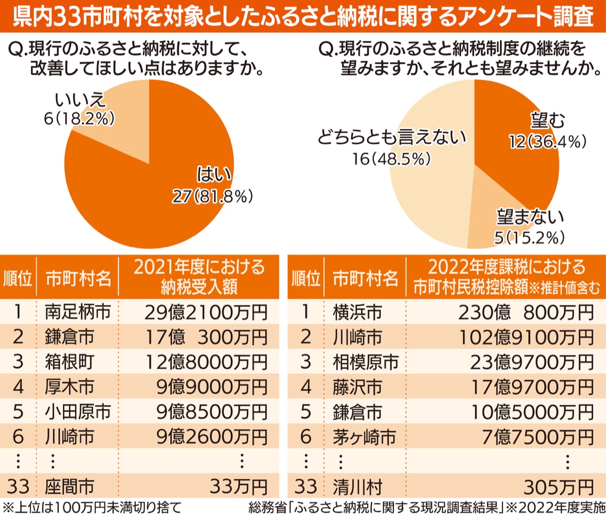 タウンニュース社では「ふるさと納税」に関して、神奈川県内33市町村の受け止めなどを探るアンケート調査を昨年末に実施した。すべての自治体から回答があり、8割を超える27自治体が現行制度について何らかの改善を希望していることなどが明らかになった。