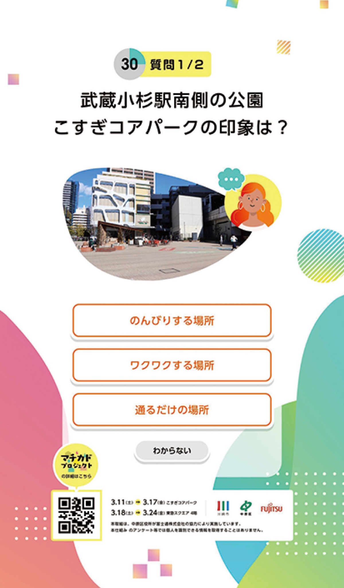 設置されるのは高さ2メートル、幅1メートルほどの装置。市制100周年や環境問題などをテーマに選択式の質問が表示され、誰でも気軽に回答でき、関連する行政情報も発信される。11日から17日(金)がこすぎコアパーク、18日(土)から24日(金)は武蔵小杉東急スクエアに設置予定。