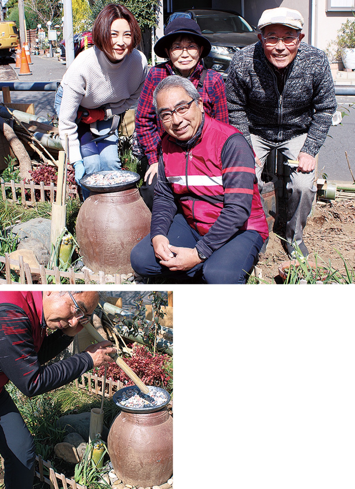 自作したのは同遊歩道の草花の手入れをしているボランティアメンバーで、井田三舞町の村越俊之さん=人物風土記で紹介。1月にメンバーの知人からつぼを譲り受け、以前から構想していた水琴窟づくりに着手した。実験を重ね、一定の大きさの水滴を上から落とすことで音が鳴ることを確認。「穴の大きさを変えたりスポンジを使ったり、水滴を作り出すことに苦労した」と村越さん。水を注いでから水滴が落ちる間隔も2、3秒にしたことで心地よい反響音が鳴り響くという。水琴窟の横には竹筒を置き、誰でも音色を楽しめるよう配慮した。。村越さんは「散歩ついでに耳を傾けて、心を癒す静かなときを過ごしてもらえたら」と話している。