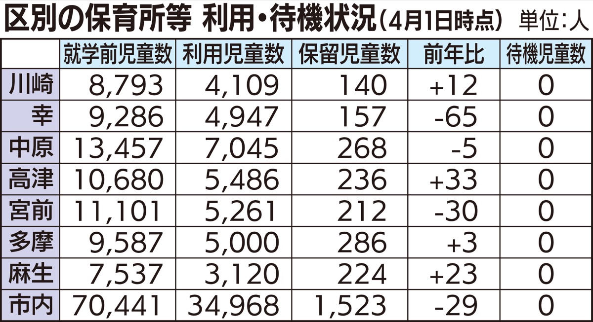 川崎市は認可保育所等に入れない待機児童数が4月1日時点で3年連続ゼロになったと今月発表した。就学前児童数は前年比3170人減の7万441人だったのに対し、保育所等利用申請者数は前年度比384人増の3万6491人に。利用児童数も受入枠拡充に伴い、前年比413人増の3万4968人でいずれも過去最多だった。
