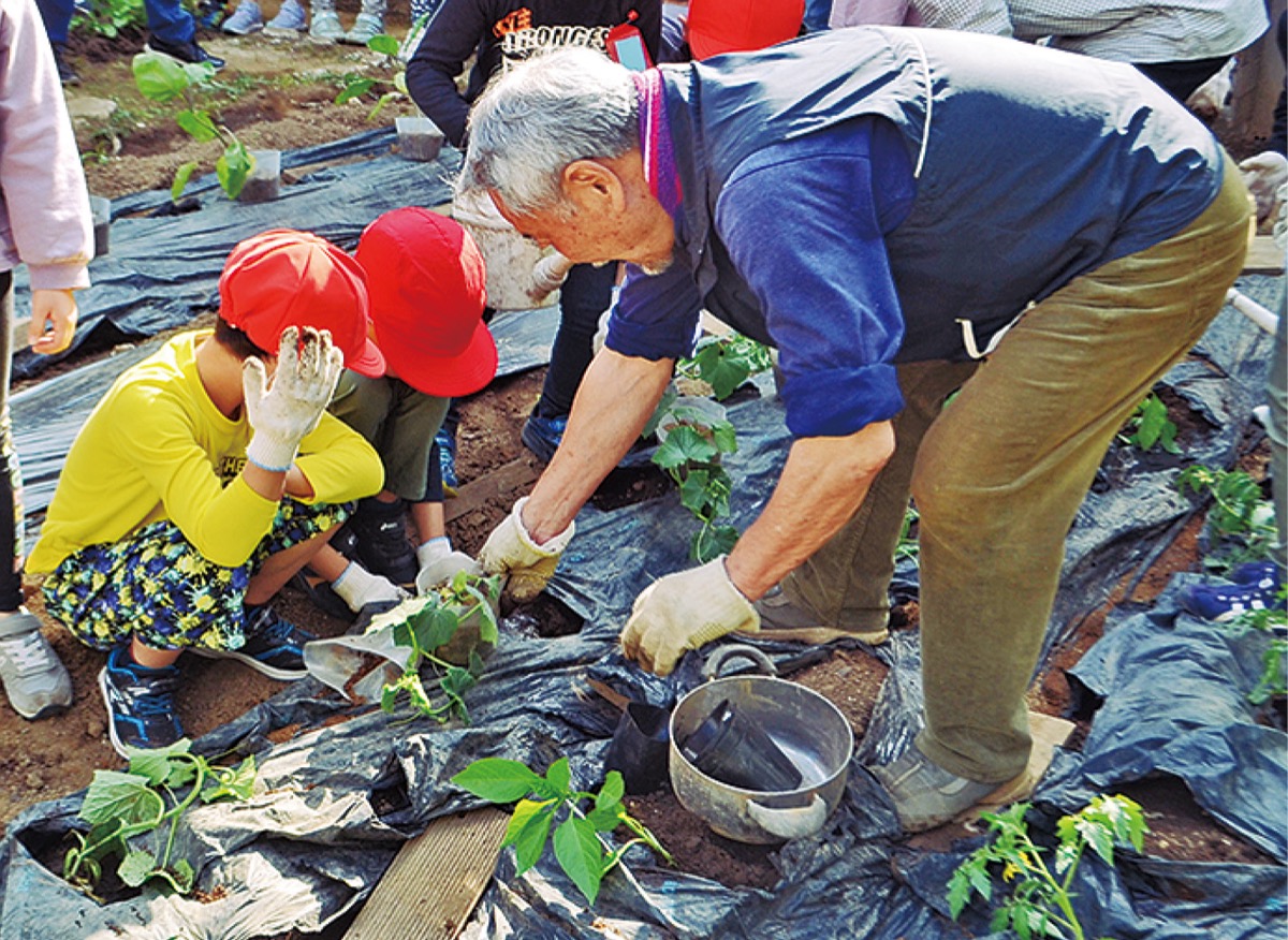 食の大切さを感じ、畑で自ら作ることを体験してもらいたいと行われたもの。当日は敷地内にある学童の畑に、学年ごとに子どもたちが集合。ナスやキュウリ、トマト、ピーマンなどの夏野菜の苗植えや水やりを体験した。参加した1年生の児童は「野菜を植える時に、いっぱい育ってほしいと思った」と笑顔。別の児童は「野菜が育ったらたくさん料理したい」と期待を込めた。4年生から6年生の児童は、生ごみから堆肥を作る体験にも参加した。