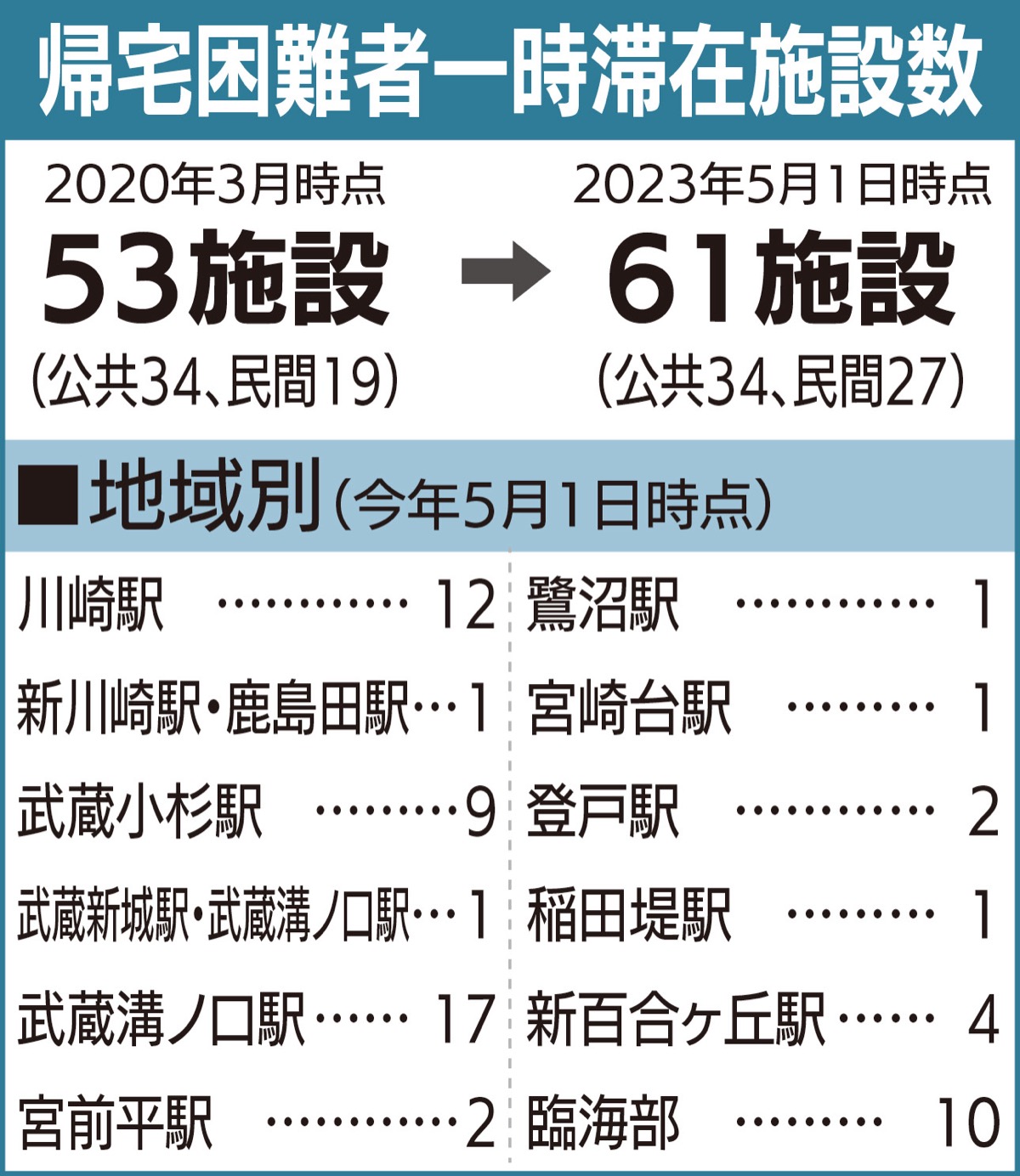 大地震により鉄道などの公共交通機関が止まり、行きどころのない人を一時的に受け入れる帰宅困難者一時滞在施設。市は、川崎、武蔵小杉、溝口などの主要駅周辺を中心に、現在61カ所を指定している(今年5月1日時点)。災害時の帰宅困難者は市内で約3万8000人(平日15時)と推定され、公共施設だけでは不十分とし、市は民間施設に協力を依頼。ここ3年余りで新たに8カ所増やし、民間施設は全体の4割を超える。