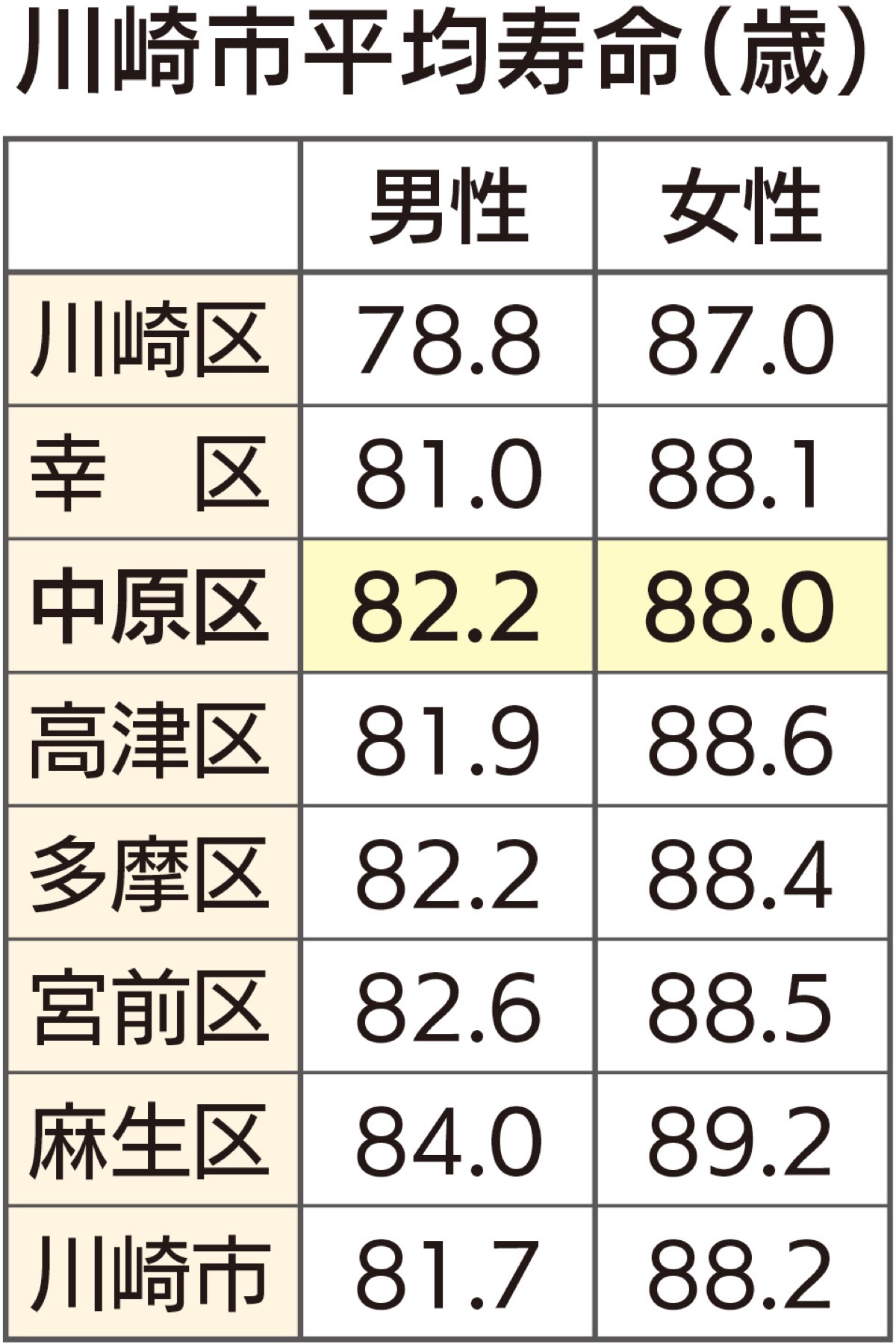 市内では川崎区が最も短く、男性78・8歳、女性87歳だった。全国では、大阪市西成区が男性73・2歳、女性84・9歳と、男女とも最も短い結果だった。