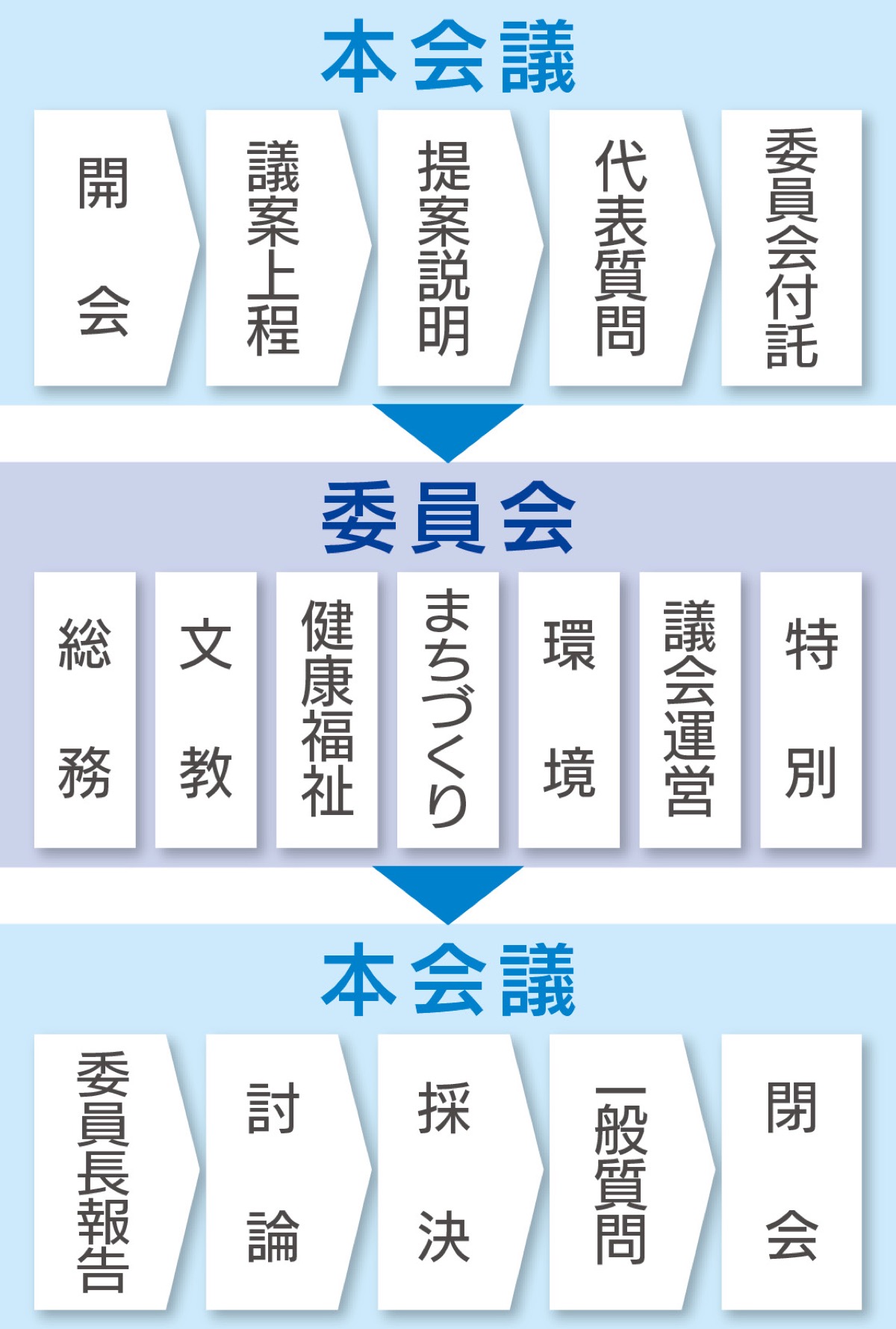 市議会には、年4回定期的に開催される定例会(2月、6月、9月、12月)と、必要に応じて開催される臨時会があります。議会活動の大きな流れとしては、まず、議員が全員出席する本会議で議案が提案されます。会派ごとに代表質問をした後に、各委員会に議案が付託されます。次に各委員会に分かれて、専門的な立場から議案に関する詳細の審査を行います。最後に、本会議を再度開き、委員会の報告を受けて、討論が行われ、議員全員で議案について採決を行います。6月と12月には、採決後に議員がそれぞれ市政に関する様々なテーマについて一般質問を行います。