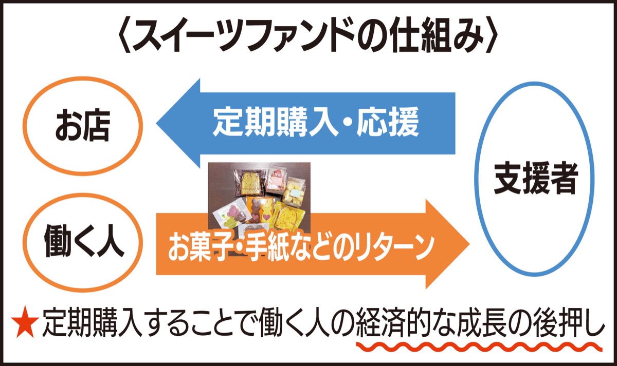 福祉作業所で働く障害者の社会参加の機会につなげる取り組み「スイーツファンド」が区内で進められている。菓子の定期販売で経済的にも後押しをしたい考え。購入者には菓子と商品、手紙などが届く仕組み。