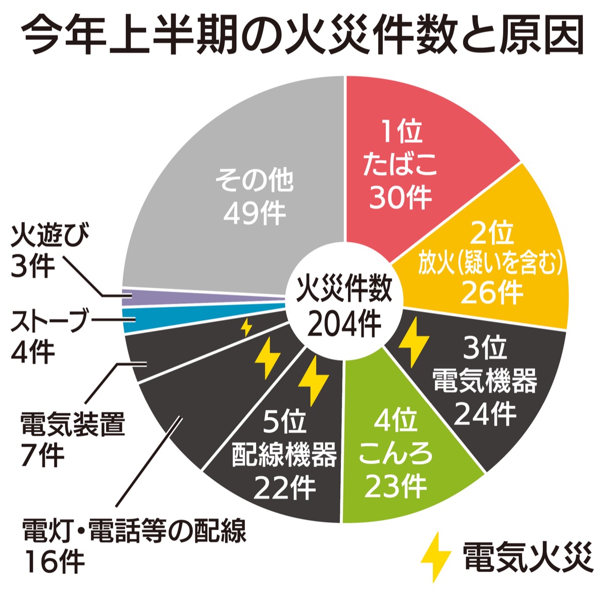 上半期の市内火災件数は204件で(前年比35件増)、過去10年で最多となった。原因で最も多いのはたばこが30件(同14件増)、次いで放火26件(同3件減)、電気機器24件(同13件増)と続いた。