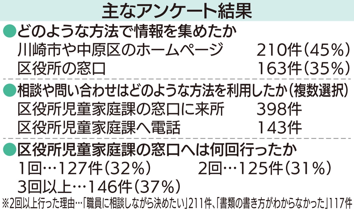 子どもを保育所等に入れるための保護者の活動を指す「保活」。中原区は市内7区の中でも子どもの数が多く入所希望者も多いため、情報提供に生かし入所申請時の負担軽減につなげようと、初めてアンケートを行った。6月1日から7月15日まで、区内の保育所等に通う0〜2歳児の保護者を中心に保育所の連絡アプリで周知し、3千人ほどの対象者のうち469人から回答を得た。