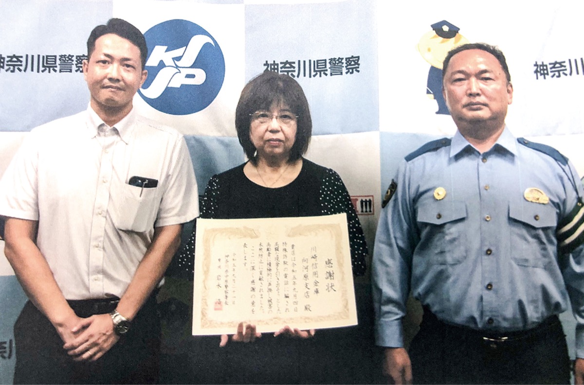特殊詐欺の被害を未然に防いだとして川崎信用金庫向河原支店は9月21日、中原警察署から感謝状を受け取った。贈呈式には副支店長の樋田健さん(41)と行員の小崎るり子さん(62)が出席。