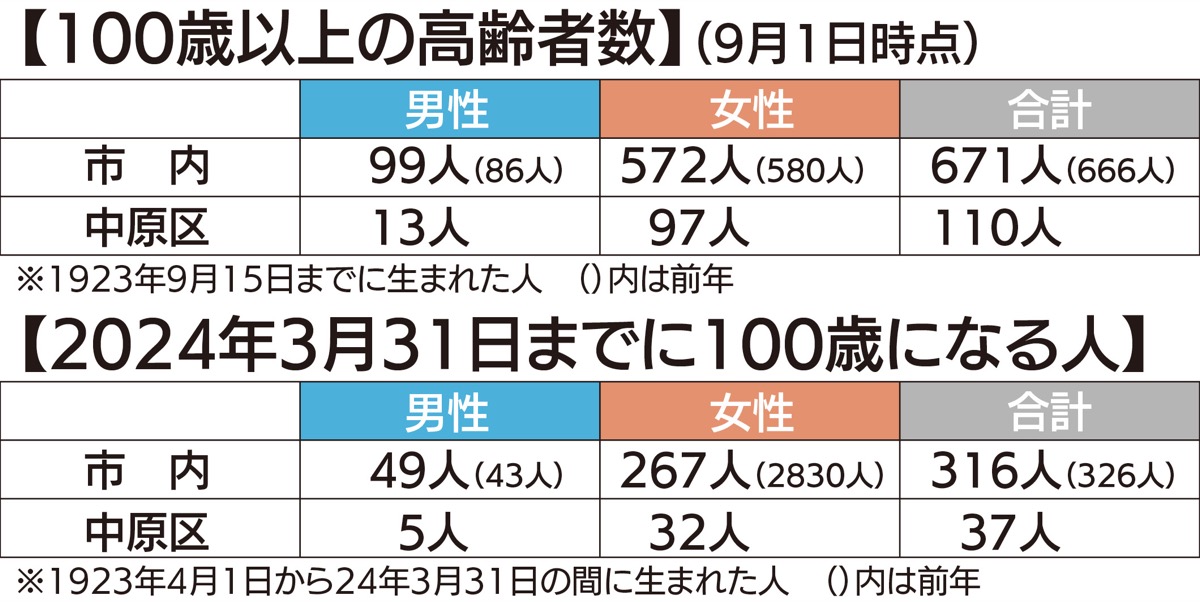 1923年9月15日までに生まれた市内在住の100歳以上の高齢者671人の内訳は男性99人、女性572人。中原区では110人(男性13人、女性97人)になっている。また23年4月1日から24年3月31日の間に生まれ、来年3月31日までに100歳を迎える高齢者は316人で内訳は男性49人、女性267人。中原区では37人(男性5人、女性32人)が対象に入る。
