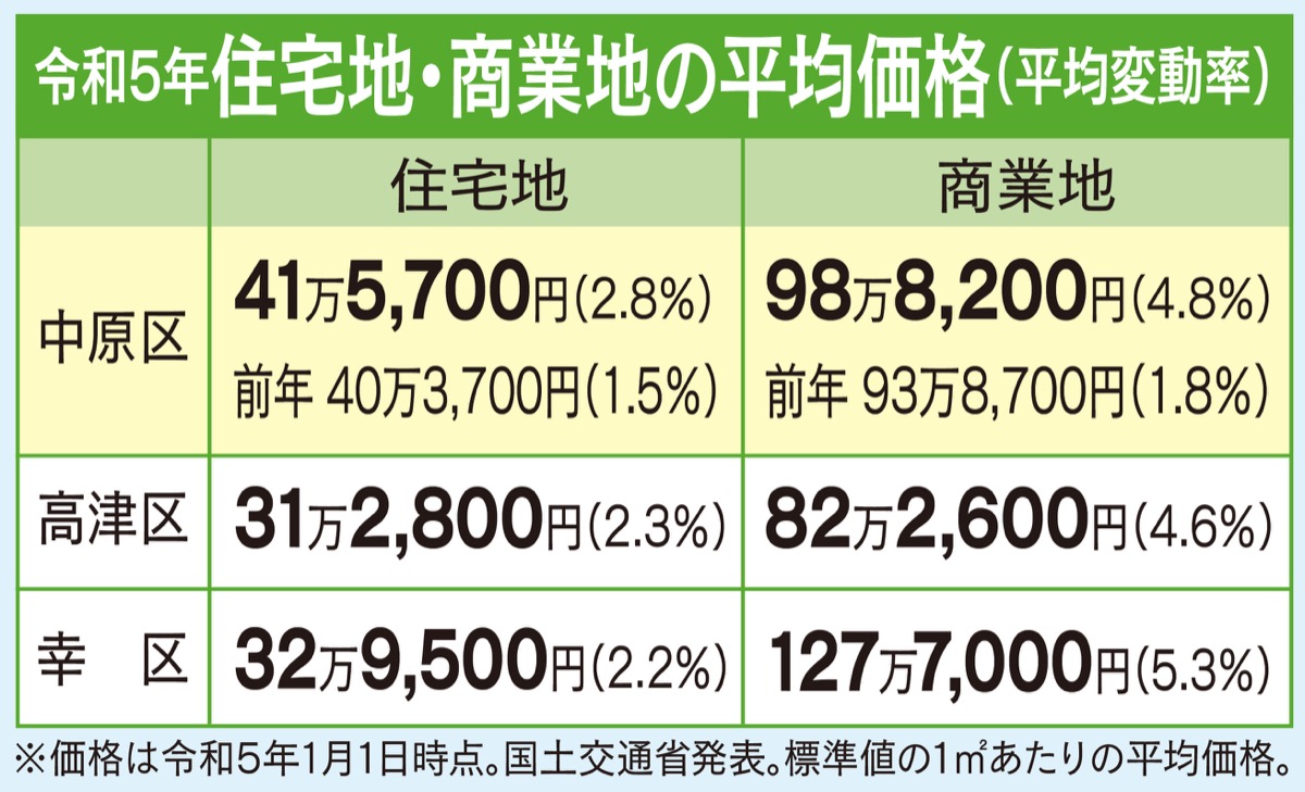 国交省が今年3月に公表した令和5年の公示地価では、都心に近い川崎市の住宅地は上昇傾向が強く、価格変動率は1・7%と上昇率が拡大。中原区は2・8%増で、11年連続の上昇。起伏のある地勢や交通利便性に劣る地域でも、コロナ禍における在宅時間の増加から、広い敷地を求めるような住環境の改善を望む需要増などが見られるという。商業地の変動率も4・8%で大幅に上昇。