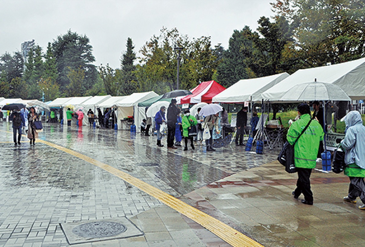 45回目を数える中原区民祭が10月15日に等々力緑地で行われた。朝10時の開始前からあいにくの雨に見舞われ、会場の人出はまばらとなり、早々に出店を断念した団体も。それでも昼過ぎから太陽が顔を出すと来場者も徐々に増えていった。