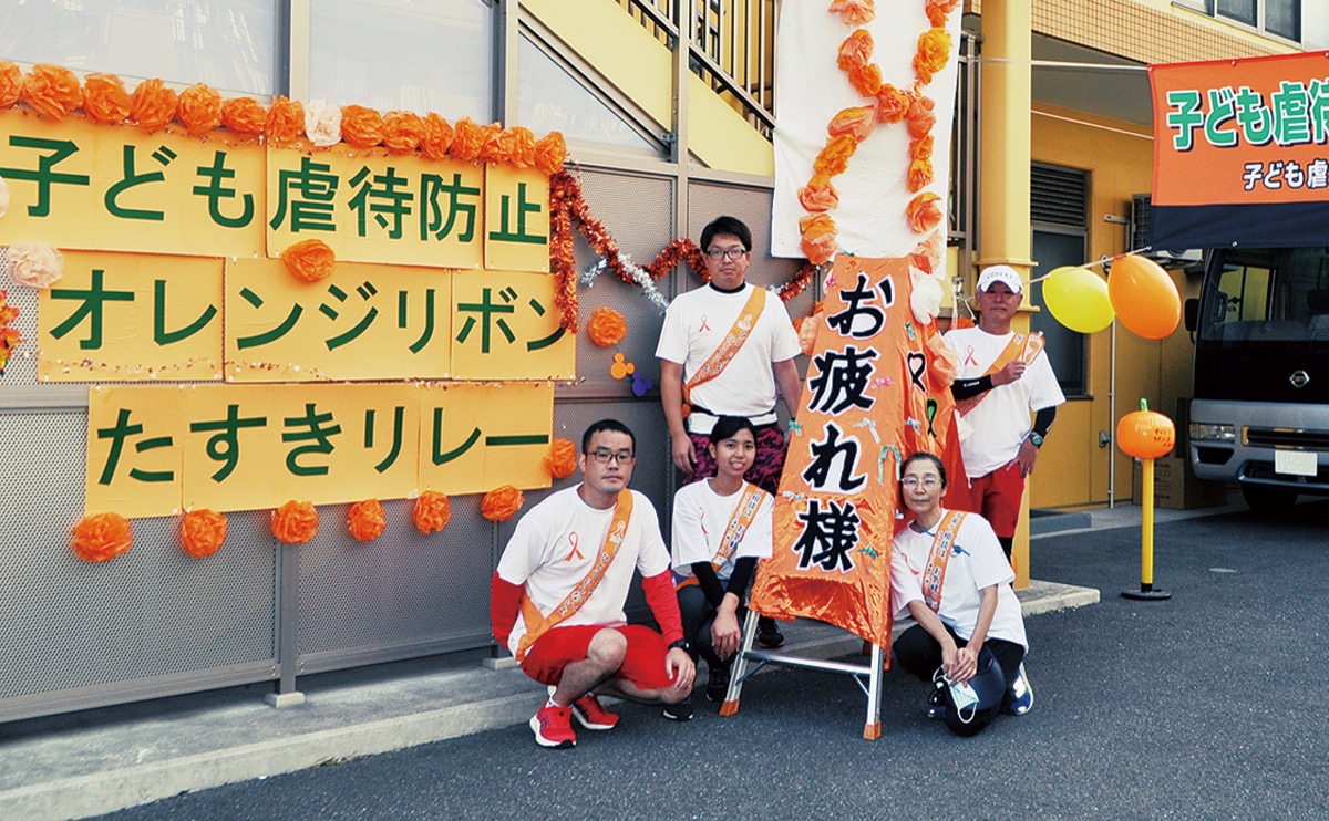 子どもへの虐待防止を訴える「オレンジリボンたすきリレー」が、10月22日に川崎市内などで行われた。中原区では社会福祉協議会(上小田中)と新日本学園(木月伊勢町)を経由し、職員らが走者として参加した。