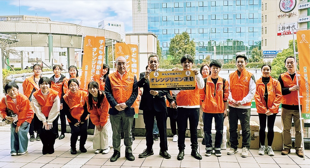 溝口駅前では初めて、児童虐待防止の啓発グッズやチラシを配布。川崎リバティライオンズクラブら8団体の関係者が、「ひとりじゃないよ、ひとりにしないよ」と表記したプラカードやのぼりを掲げ、通行人に呼び掛けた。新日本学園への継続的な支援を続ける同クラブの山本賀也会長は「一人でも多くの人に支援の輪を広げていくことが大切」と話した。