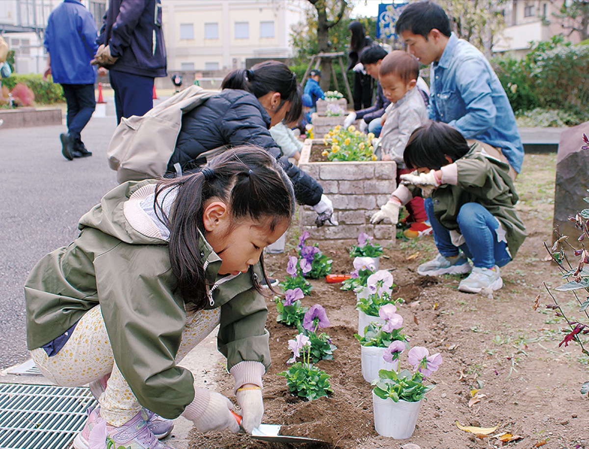 中原区役所正面玄関前の花壇で11月11日、親子らによる花植え体験が行われた。会場には40人ほどが集まり、主催者である花クラブ実行員会メンバーと一緒に、パンジーやビオラなど10種類以上200株の花を植えた。