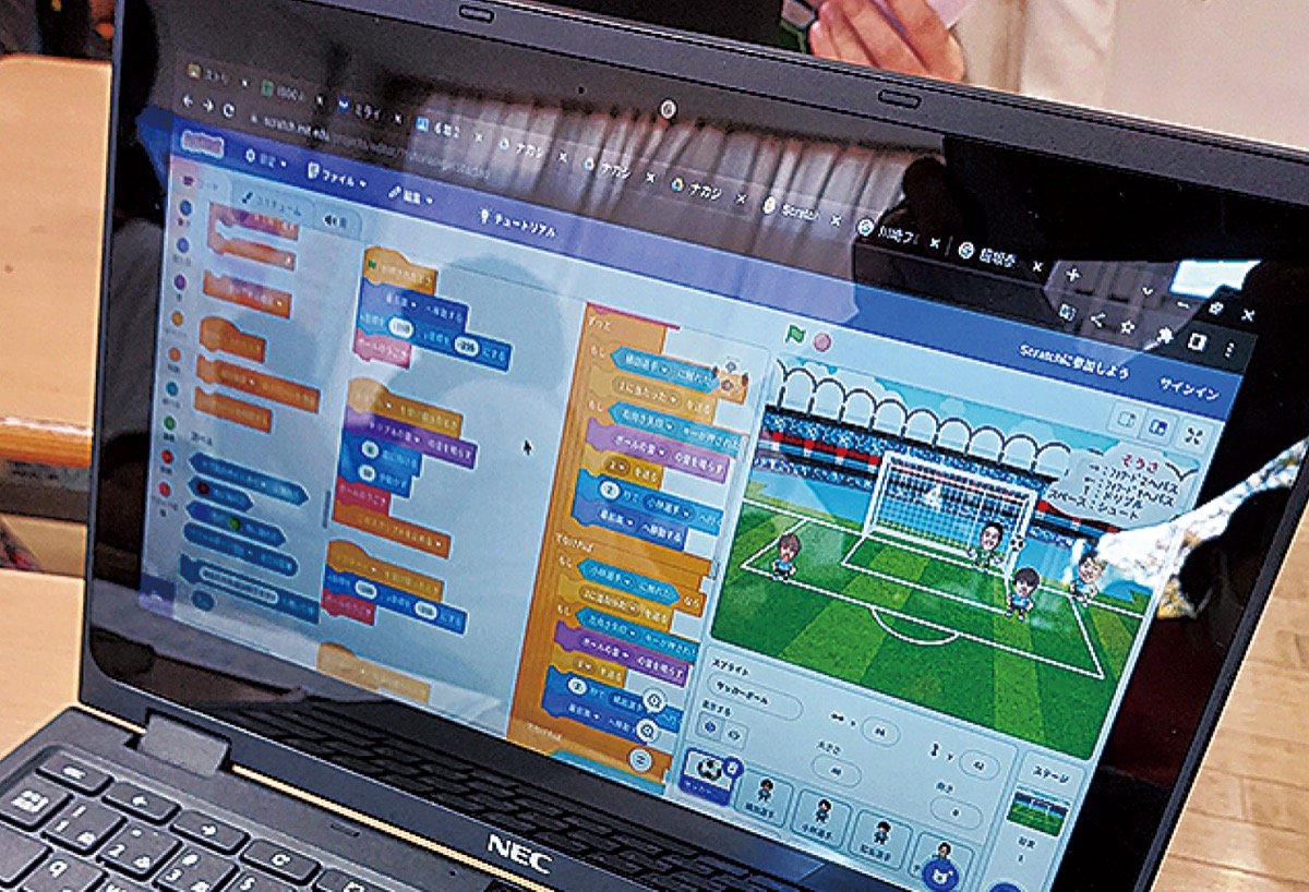 中原区に本社を構える(株)アルファメディア(小湊宏之代表)は11月13日、子母口小学校(高津区)の6年生に向けて、サッカーをテーマに川崎フロンターレとコラボしたプログラミング授業を開いた。