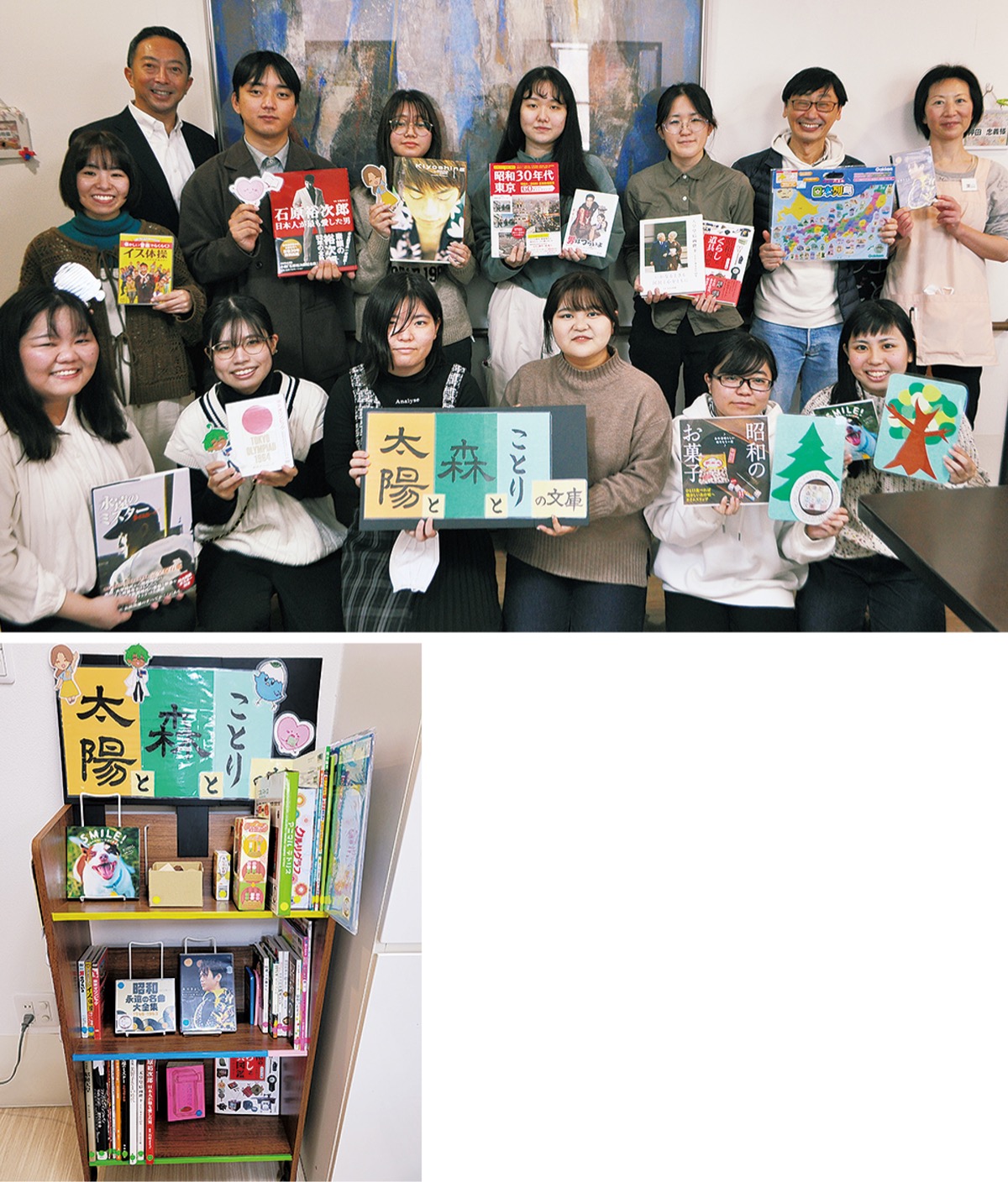 「昭和のお菓子」「永遠のミスター」「石原裕次郎」――。一時代を築き、興味をそそるタイトルがつけられた書籍の数々。11月27日、バナナ園グループが運営する「のんびりーす等々力」を訪れた沖縄国際大学(宜野湾市)図書館情報学のゼミ生11人が、自ら選書した本を集めた図書コーナーを設置した。沖縄のイメージと安らぎをもたらそうと、「太陽と森とことりの文庫」と命名し、ポップを貼るなどの工夫も。完成した文庫を目にした施設利用者は、早速本を手に取り、興味深そうにページをめくっていた。