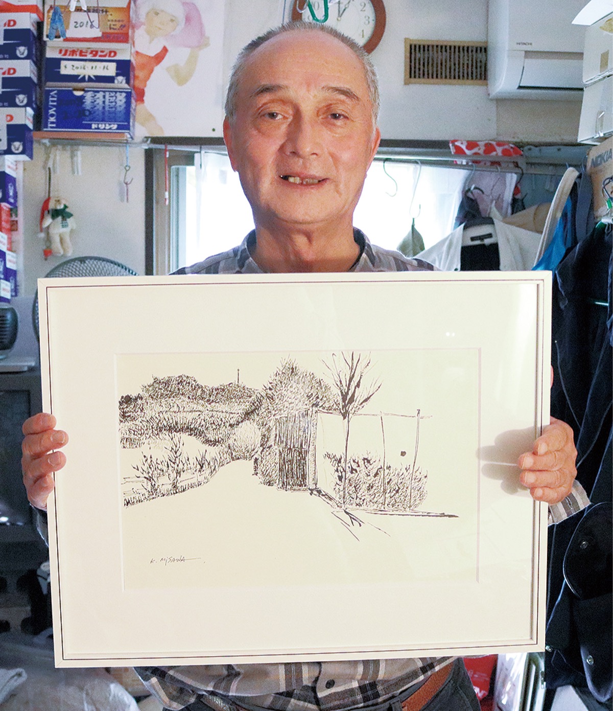 多摩区宿河原に住む、割り箸画家の三澤清太さん(71)。割り箸の先をカッターで削り、鉛筆の形状にして、墨汁で絵を描く。木に染み込みやすい墨汁と、線に味わいが出るとの理由から表面にざらつきのあるワトソン紙を使用している。