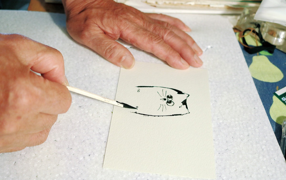 墨汁だけで完成させる場合もあれば、デッサンを割り箸で行った後、筆を使って絵の具で色をつける作品もある。「割り箸を立てる角度によって、線が細くなったり、太くなったり。味のあるざらつき感が出せるのも魅力」と語る。
