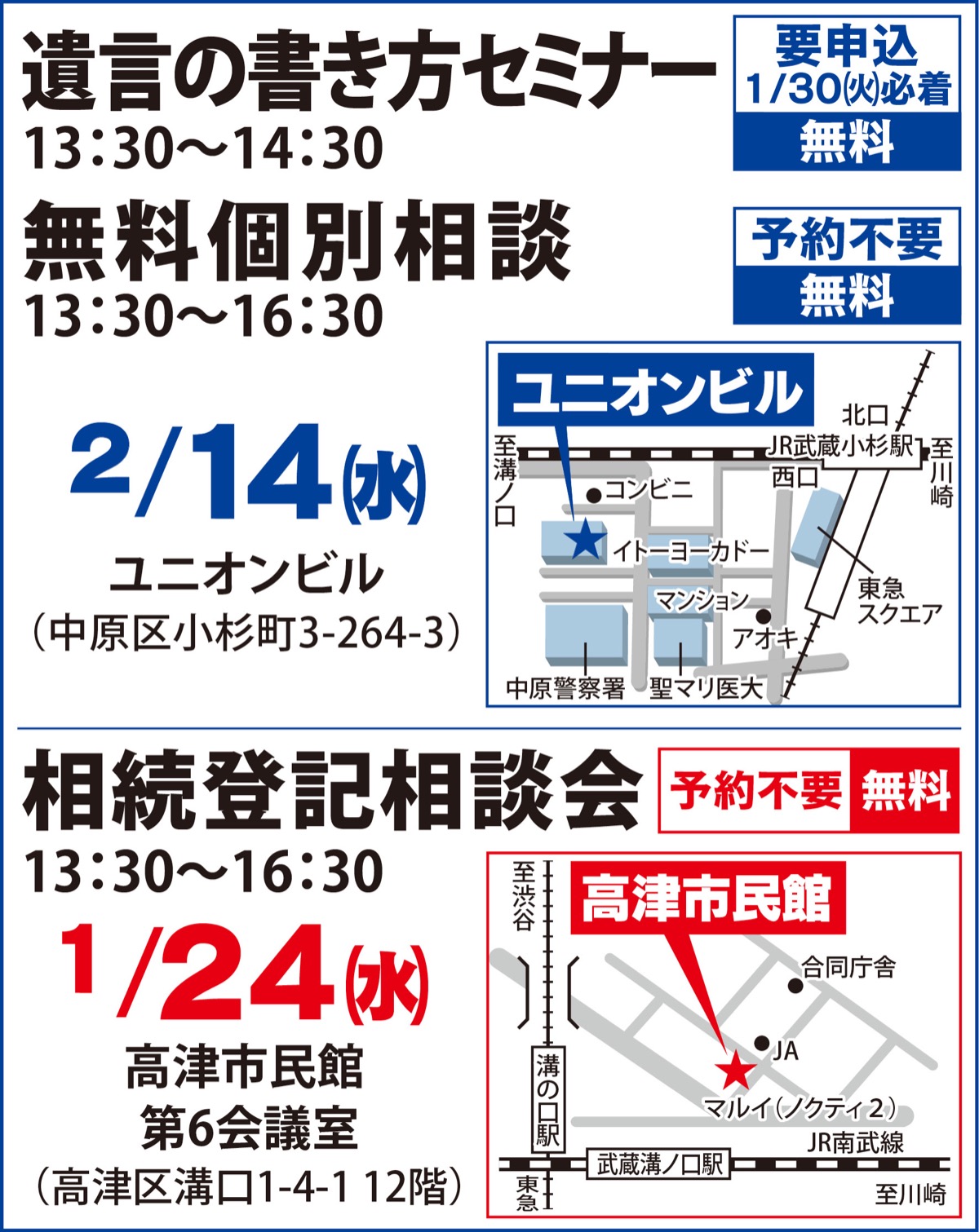 同セミナーに先立ち、1月24日(水)には、相続登記メインの相談会が、高津市民館第6会議室(ノクティ2の12階)で開かれる。時間は午後1時30分〜4時30分。