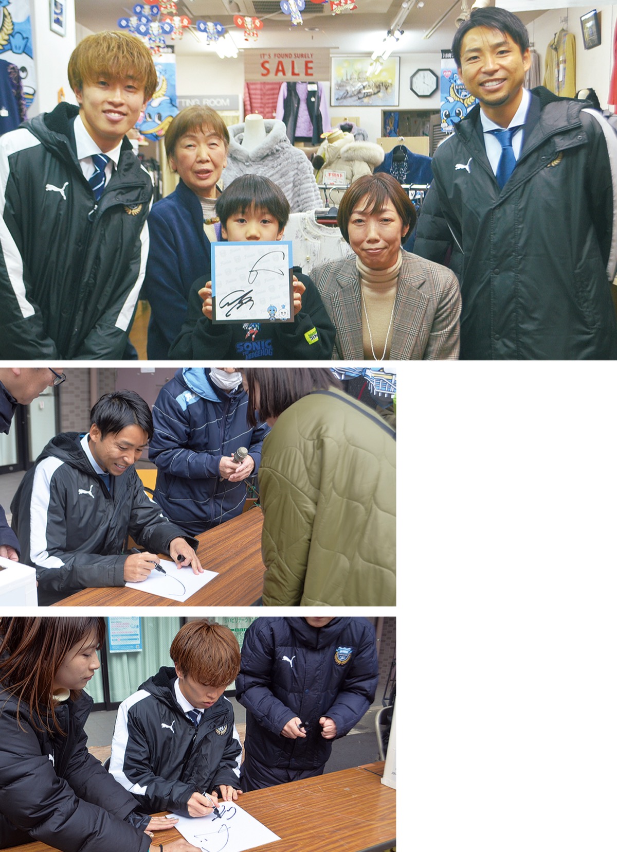 武蔵小杉商店街には、小林悠選手と山本悠樹選手が登場。サポートショップへの挨拶回りを行い、今市橋付近でサイン会を実施。小林選手は「今年は複数のタイトルを取り、皆様に恩返しできるように頑張りたい」、山本選手は「チームの勝利のために自分の力を発揮できたら」と意欲を見せた。コロナ禍にサポーターになったという長谷川未央子さん(37)は「緊張したけれど、思いを直接伝えることができてよかった」と笑みを浮かべた。実家が長年サポートショップを営む洋服店だという川島渓太さん(9)は「サッカーを習っているので、プロのサッカー選手と会えてうれしかった」と喜んだ。