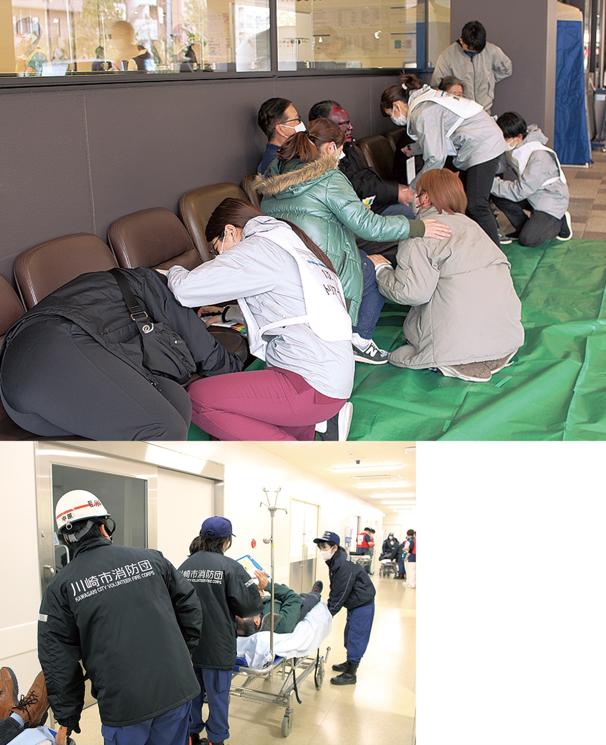 日本医科大学武蔵小杉病院(谷合信彦院長)は1月20日、救命救急センターなどで首都圏直下型地震に備えた訓練を行った。中原消防団、中原消防ボランティア委員会と連携し、けが人役として小杉町一丁目町内会、一般参加者ら約150人が参加した。