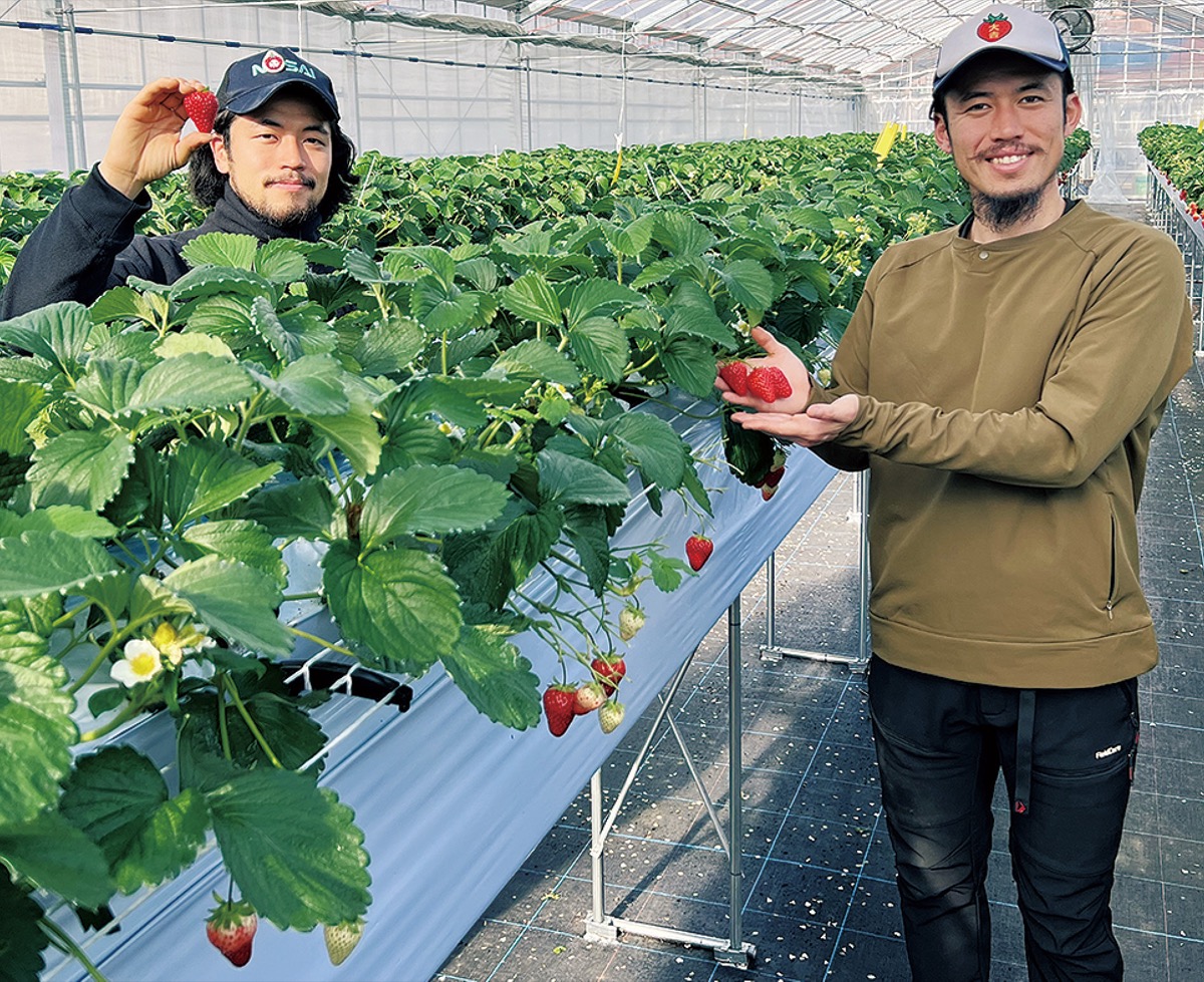 イチゴ栽培を手掛けるのは井上稔夫さん(30)と法久さん(26)兄弟。今までは、枝豆や白菜、のらぼう菜など葉物野菜を中心に栽培してきたが、生産量が減少する冬から春にかけて新たな目玉が欲しいと考え、イチゴへの挑戦を決意。昨秋、農園の約300平方メートルの敷地にビニールハウス3棟を構え、知り合いの農家から譲り受けた品種「紅ほっぺ」の苗約4千株を植えた。水やりや温度管理を自動で行う設備や受粉を促すハチなども導入。稔夫さんは「ハウス栽培自体が初の試みでノウハウもない中で始めたが、想定以上に立派に育ってくれた」と手応えを口にする。