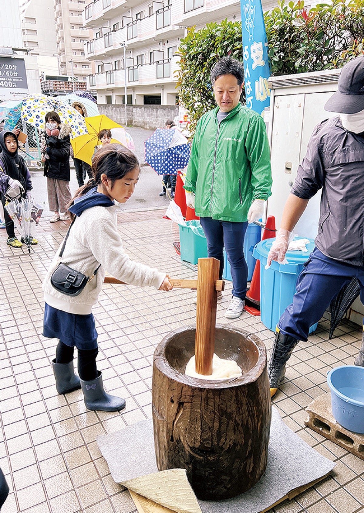 用意されたもち米は約35kg。町会役員ら40人ほどで協力し、伝統の臼と杵を使い威勢よく餅をついた。体験した児童も、周囲の「よいしょ、よいしょ」の掛け声とともに何度も杵を振り上げた。全員におもちゃも配られ満足げな表情が見られた。餅はきなことあんこの2種類でパックに詰め、約250セットを200円で販売。田口代表は「雨の中、大勢の方にお越しいただいた。売上は能登半島地震の被災者に寄付する」と話した。