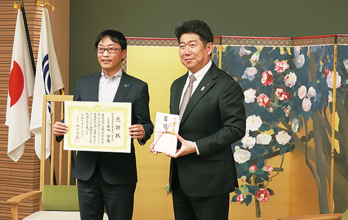 同社の柴田学川崎支社長らが市長に目録を手渡すと、市長は「こうして地域企業からご支援いただけることは本当にありがたい。しっかりと市民の健康増進のために役立てます」と述べ、感謝状を渡した。