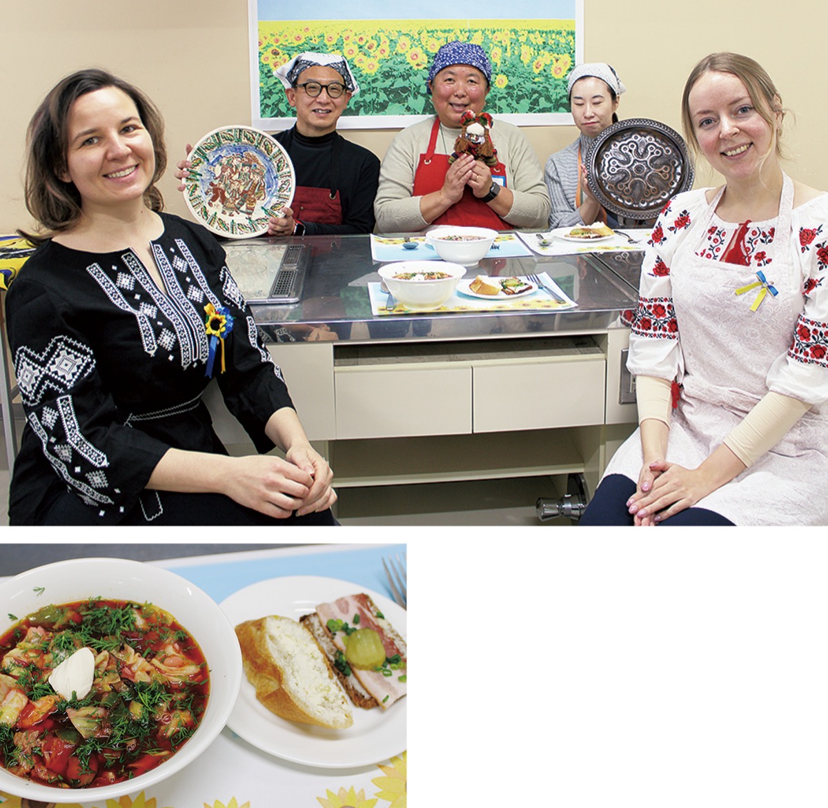 ウクライナから避難してきたチャシカ・リリアさん(37)が講師となり、参加者に教えた料理は同国では日常的に食べられているボルシチと黒パンのサンドイッチ。伝統柄の衣装を着たリリアさんの丁寧な指導で調理を楽しみ、ウクライナに関するクイズなどで盛り上がった。初めてウクライナ料理を食したという参加者は「ビーツの赤みが見た目にもきれいで、優しい味わいだった」と話した。
