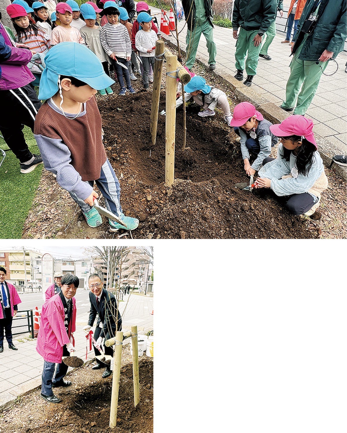 同会の松原成文会長は「等々力緑地がいずれモモの名所となるよう地域で協力し管理していきたい」と話し、園児を見守った同園の永田ゆかり園長は「これから目の前で成長を見届けられるのが楽しみ。参加した園児の成人式の日に、この地で再会できたら」と思いを馳せた。