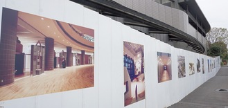 2019年の台風被害で閉館した旧川崎市市民ミュージアムを囲う「仮囲い」の壁面を使い、旧ミュージアムの歴史を伝える装飾展示が3月29日から始まった。第一弾として、旧施設の構想から完成までを伝える設計図や建設写真など、計18枚の画像を掲示している。