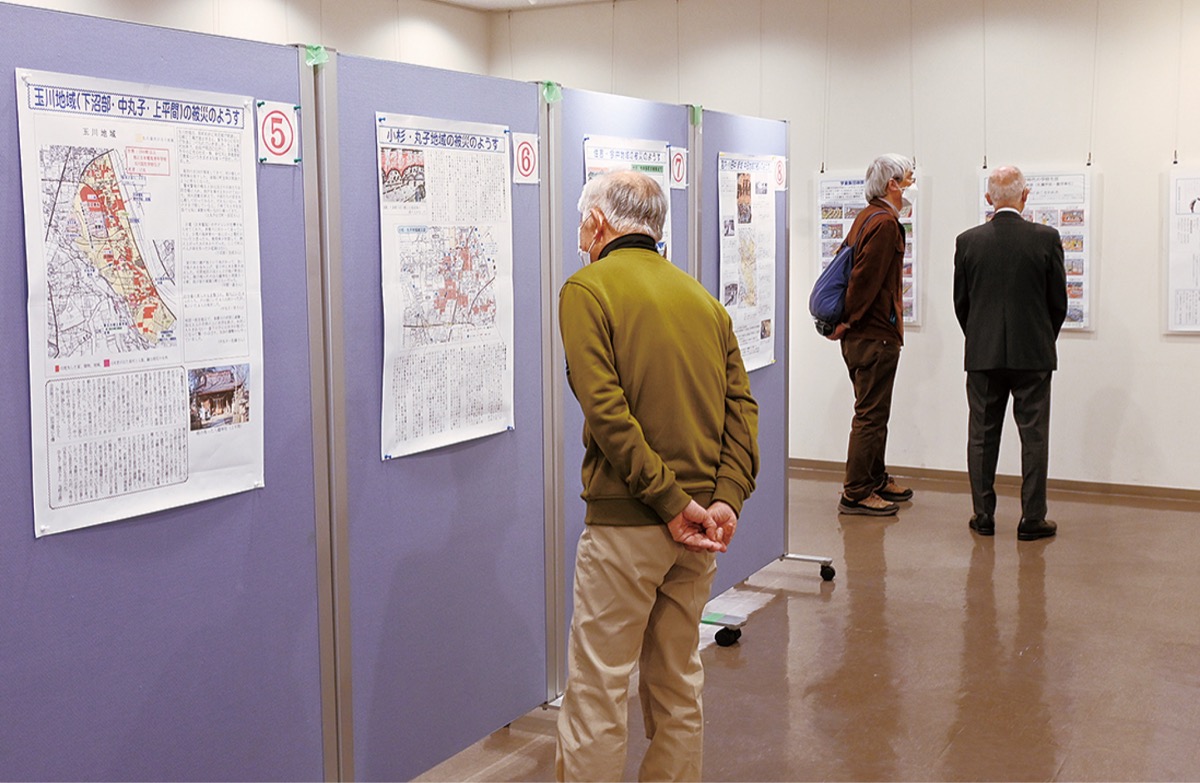 期間中は、玉川、小杉・丸子地域などエリアごとに、聞き取り調査で判明した焼夷弾が落ちた場所、火災の発生場所などの被災状況や被災者の証言を、当時の地図に落とし込んで作成した資料を展示。今年初めて、幸区延命寺に建つ「御幸地区戦災死者氏名碑」に刻まれた160余名の名前を掲出し、川崎大空襲後に房総半島に墜落した米軍B29搭乗員にまつわる西畑村事件について紹介したパネルも展示された。