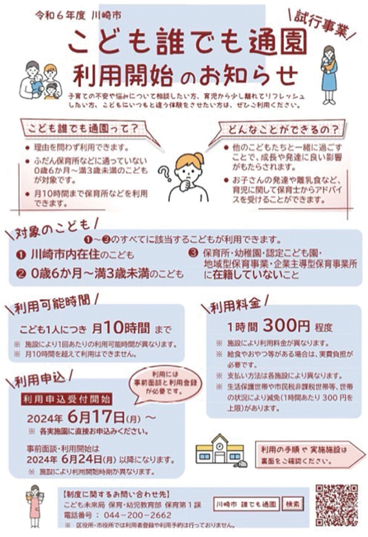 川崎市は6月24日(月)から、親の就労の有無に関係なく子どもを保育所などに預けられる国の新たな制度「こども誰でも通園制度」の試行実施を始める。これに先立ち、6月17日(月)から市内45の実施施設で利用申し込み受付を開始する。