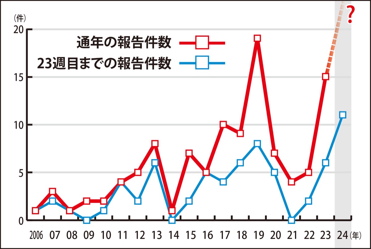市内での劇症型溶連菌感染症は、今年に入りほぼ毎月2〜3件程度報告されており、6月9日までの累積数は11件。区別では宮前区が4件で最も多く、次いで中原区と麻生区が2件。他の区はそれぞれ1件となっており、統計データが残る06年以降、最多のペースで推移している。