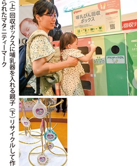 ピジョンでは、プラスチック製と耐熱ガラス製の2種類の哺乳器を展開しており、プラ製のものは、素材ごとに分別を行い、リサイクル工場で粉砕、再生原料化。プランター、食品・薬品工場ラインの配管などに活用し、ガラス製は路盤材などの製造原料の一部にリサイクルしている。今回のイベントでは、使用済みの哺乳びんを砕いたプラスチックからオリジナルのマタニティーマークをつくるワークショップも同時開催した。