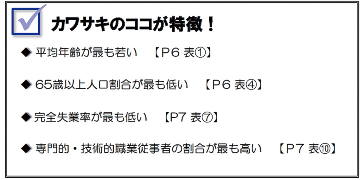 最新の「カワサキをカイセキ!」によれば、まず「人口」の面から見た川崎は「若さ」や「活発さ」を印象づける。平均年齢が43・7歳と最も若い一方で65歳以上の人口割合が20・2%で一番低い。15歳以上の人口に占める労働力人口(労働力率)は東京都区部に次ぐ2位で、完全失業率は3・3%と最も低かった。自然増加数が福岡市に次いで高く、出生率は3位で、婚姻率も東京都区部に次ぐ2位だった。