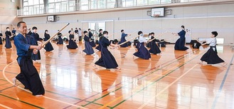 井田で道場を開く「井田剣和会」(伊藤浩一会長)は7月28日、恒例の暑中強化稽古を井田小学校体育館で開き、総勢50人が汗を流した。