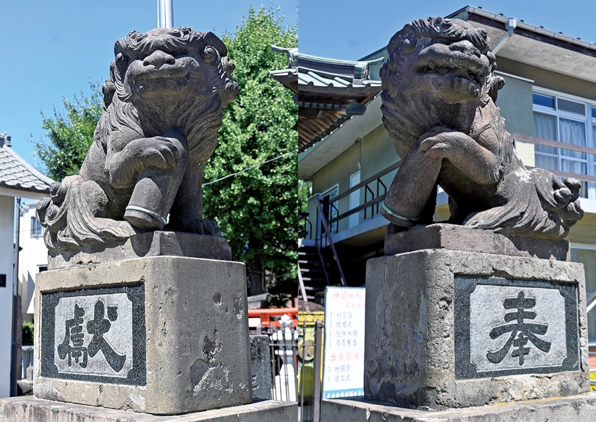 同神社の狛犬はいつできたのか、なぜ砲弾を抱えているのか、その理由が同神社のあゆみに記されていた。「明治三十七、三十八年の日露戦争に従軍した兵士十二名で奉納した物で戦勝祝いという事で大砲の弾を抱えている珍しい狛犬です」とある。1907(明治40)年10月に建立され、松原延太郎が作った記録が残っている。同神社の関係者に聞くと「明治時代の話で当時を知る人もいない。この資料に残っているだけ」とその経緯について話す。