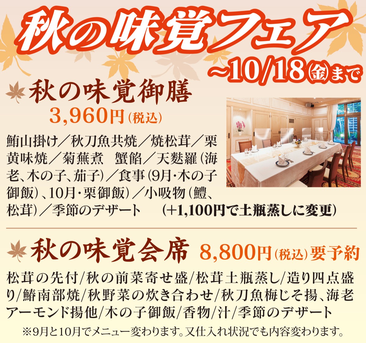秋の味覚フェアスタート!武蔵小杉の個室会食、レストラン