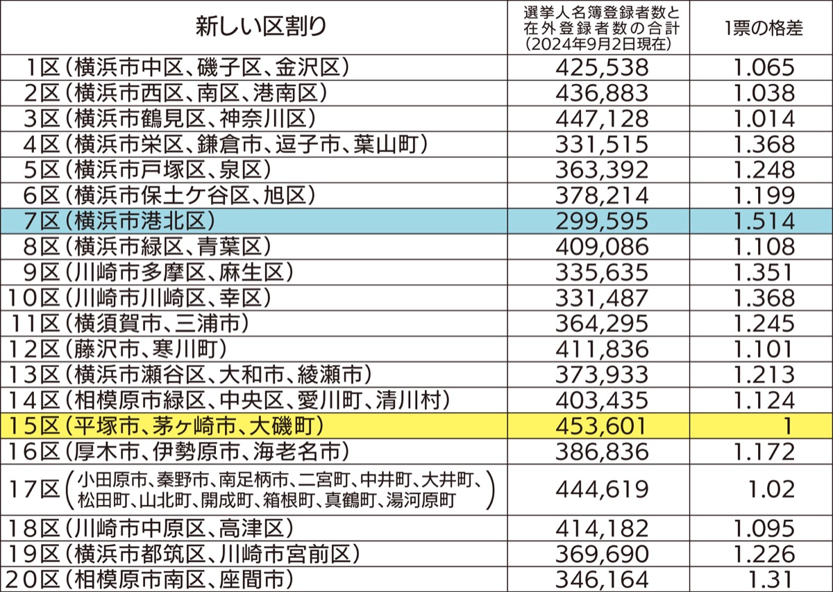 前回2021年の選挙で「1票の格差」を有権者数で試算したところ、旧15区(平塚市、茅ヶ崎市、大磯町、二宮町)と旧4区(横浜市栄区、鎌倉市、逗子市、葉山町)間で1・42倍だった。試算上、新区割りで県内格差は広がることになる。