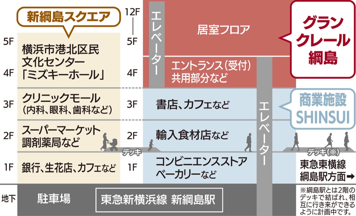 書店やベーカリー、カフェ、生活雑貨店などが入る商業フロアが下層階にあり、隣接する複合施設「新綱島スクエア」にはスーパーやクリニックに加え、区民文化センターも開業。街全体が共用部分のような感覚で日常の買い物から音楽鑑賞まで満ち足りた生活を営むことができる。