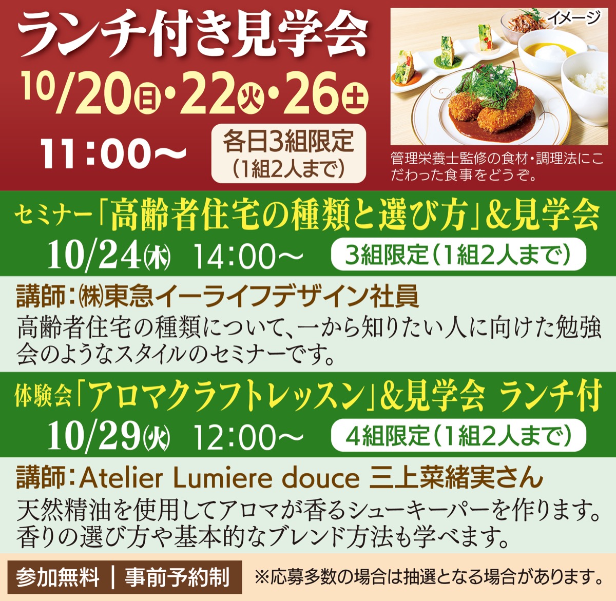 住宅の見学とともに、入居者と同じこだわりの食事を試食できるランチ付き見学会や無料のセミナー、体験会付きの見学会も開催=表。事前予約制、下記まで申込を。